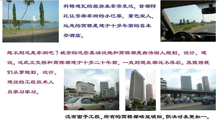 科特迪瓦的旅游業(yè)非常發(fā)達(dá),首都阿比讓號稱非洲的小巴黎,景色宜人,遠(yuǎn)處的高樓是建于十多年前的喜來登酒店。城市的基礎(chǔ)設(shè)施和高樓都是由法國人規(guī)劃、設(shè)計(jì)、建設(shè)。立交橋和高樓都建于十多二十年前,一直到現(xiàn)在都還不落后。真值得我們從事規(guī)劃、設(shè)計(jì)、建設(shè)的工程技術(shù)人員學(xué)習(xí)學(xué)習(xí)。