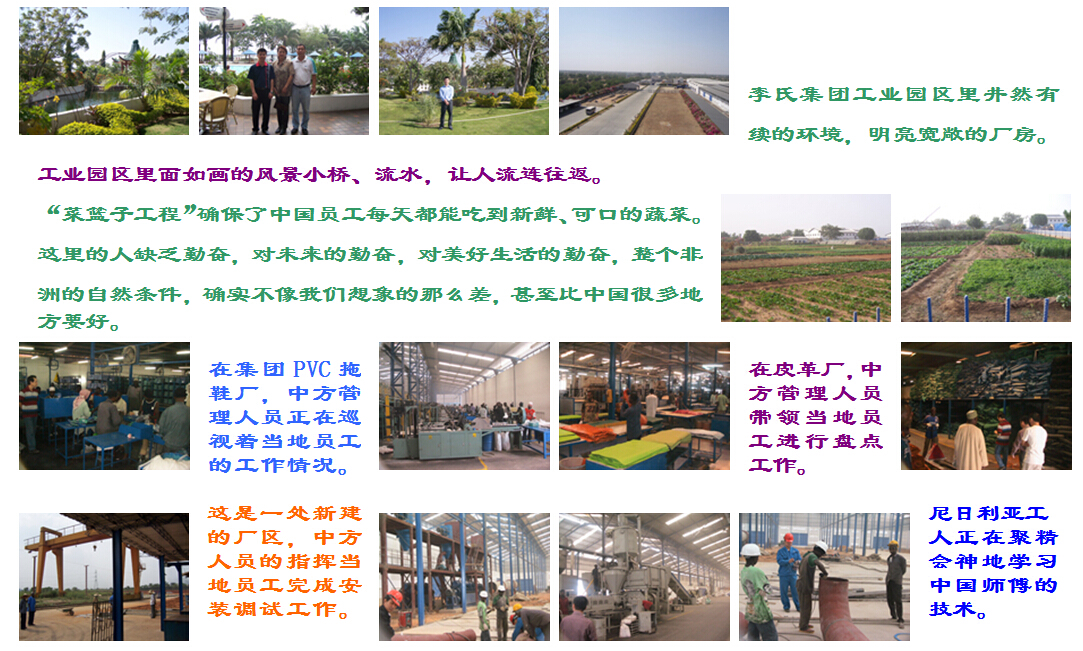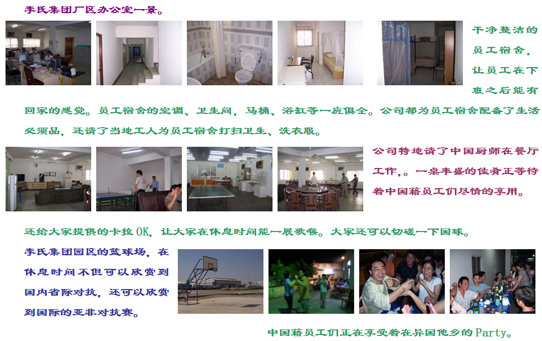 集團(tuán)在非洲各工廠共雇傭了近900多位來自不同國家和地區(qū)的海外員工,他們主要來自日本、臺(tái)灣、香港、馬來西亞、菲律賓和中國各地。其中中國員工占90%以上。每年約有200多名新員工從國內(nèi)出發(fā)前往非洲。